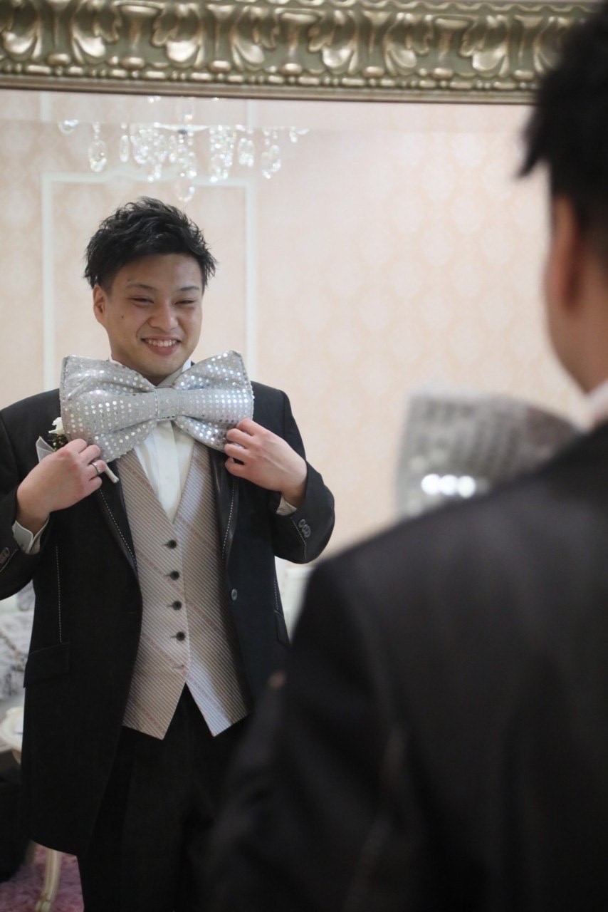 お色直しで 新婦様がカクテルドレスに着替えている時には 新郎様はビック蝶ネクタイをつけてスタンバイです♩♩