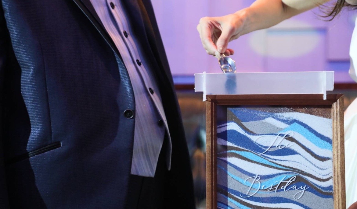 砂は混ぜると元に戻らないことから “結婚をするお二人が 永遠に一つの家族として生きていく”という意味が込められています。