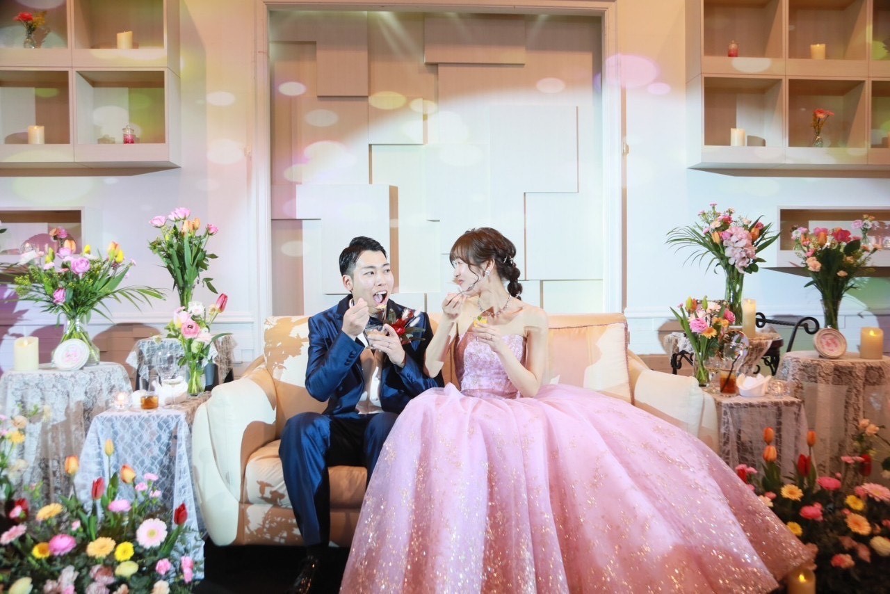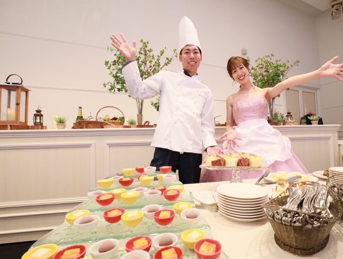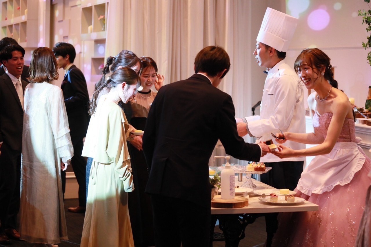 披露宴後半で行うデザートビュッフェは ゲスト様はもちろん新郎新婦様も一緒に楽しむことができます♩