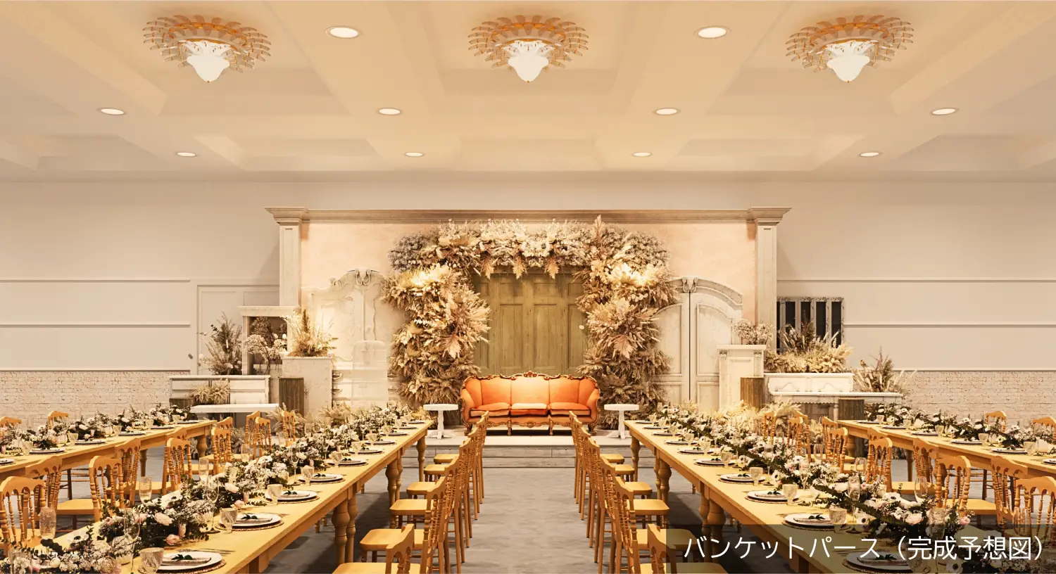 少人数から大人数までゲストの方をゆったりともてなす亊ができます。また、360度投影されるプロジェクトマッピングなどを使って思い通りの演出を自由におこなう事ができます。