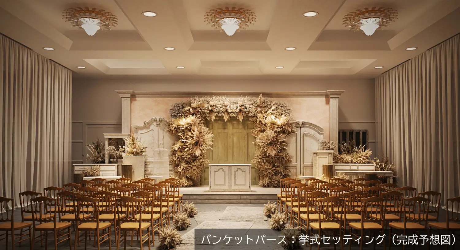 丘の上のチャペルは自然光が差し込む明るい空間となっており、自然な形でとりおこなう挙式からプロジェクションマッピングを使用した演出の挙式など自由におこなうことができます。 また、扉を開けると広がる丘の上のガーデンでゲストと最高の空間を過ごすことができます。
